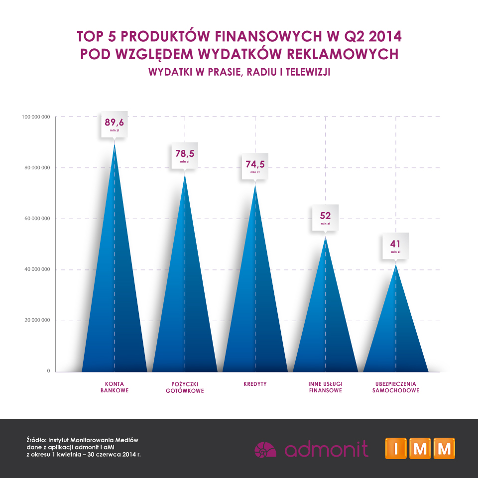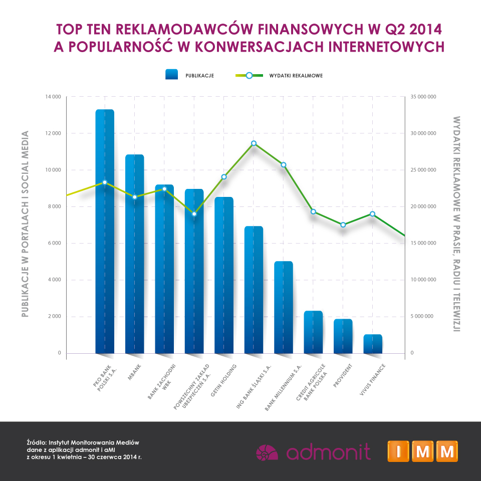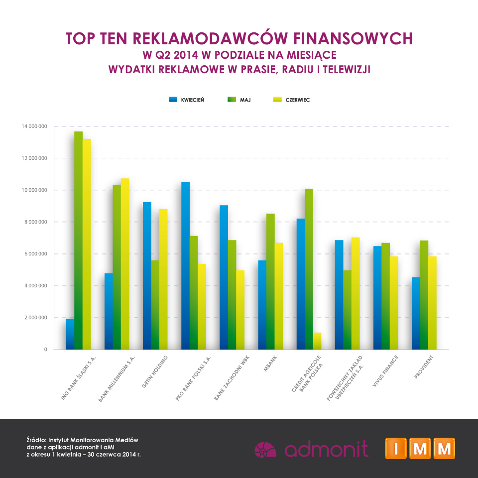 Od kwietnia do czerwca 2014 roku czołowa dziesiątka reklamodawców z branży finansowej przeznaczyła na promocję ponad 220 mln zł – niemal tyle samo, ile wyniosły wydatki w czołowej dziesiątce rok wcześniej. Liderem wśród największych reklamodawców ponownie był ING Bank Śląski, który promował się za 29 mln zł, czyli za 6 mln zł więcej niż kwartał wcześniej i 1 mln zł więcej niż w analogicznym okresie ubiegłego roku.