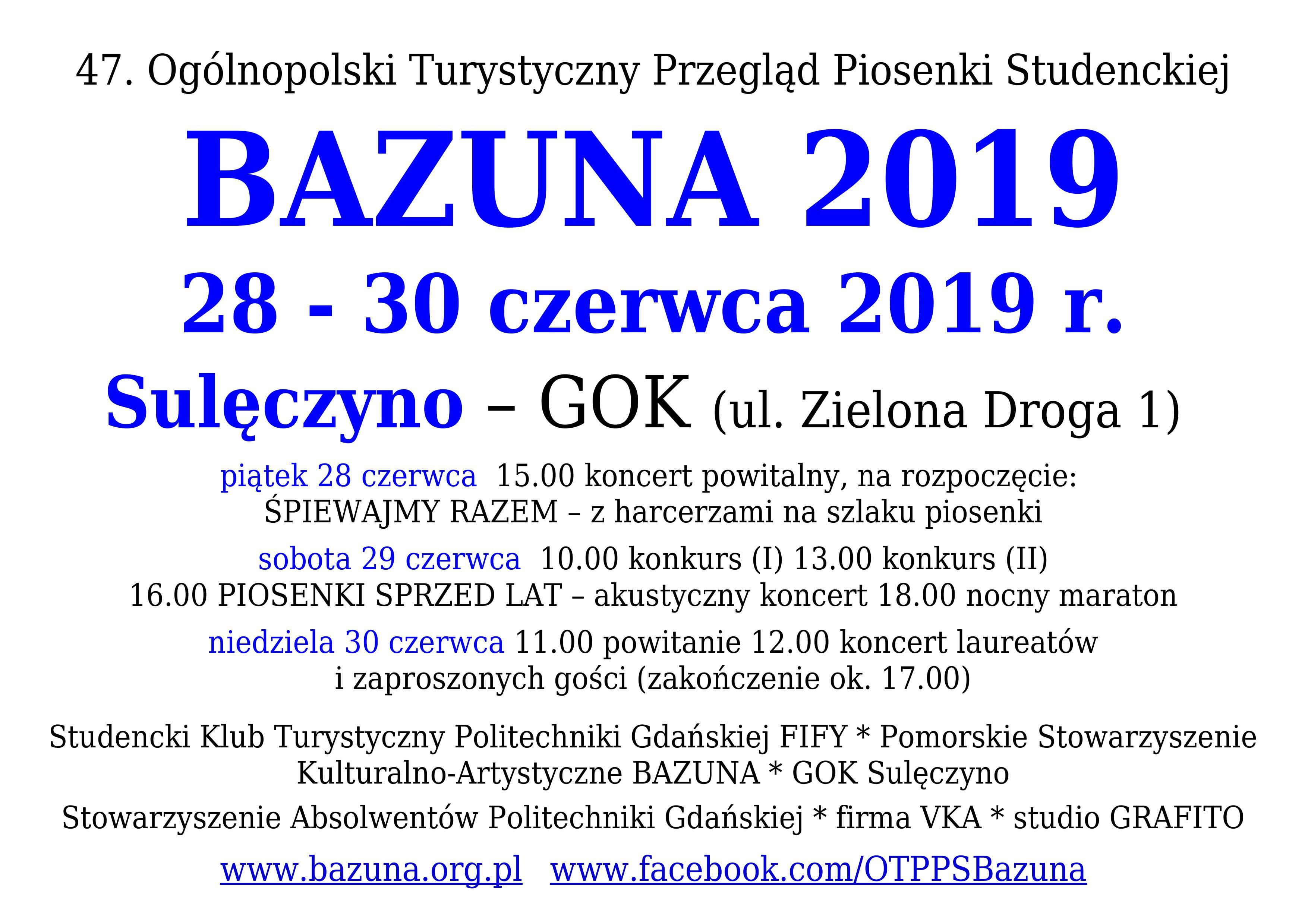 WARTO TAM BYĆ. BAZUNA – OGÓLNOPOLSKI TURYSTYCZNY PRZEGLĄD PIOSENKI STUDENCKIEJ w tym roku odbędzie się na Kaszubach, w Sulęczynie, w dniach 28-30 czerwca. Patronat medialny nad Bazuną sprawuje – wraz z Telewizją Gdańską, Radiem Gdańsk i Dziennikiem Bałtyckim – Portal CZAS POMORZA.