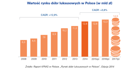 Jak wskazują prognozy KPMG, w najbliższych latach wartość rynku dóbr luksusowych w Polsce będzie rosła w nieco niższym tempie â do 2017 roku jego wartość może wzrosnąć do 14 mld zł, czyli o 11% w porównaniu z rokiem 2014. Największych wzrostów w ujęciu procentowym można spodziewać się w segmencie biżuterii i zegarków oraz usług hotelarskich i SPA.