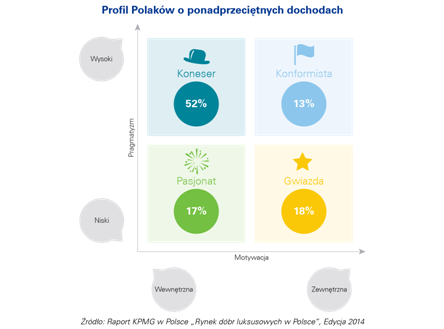 Grupa Polaków o ponadprzeciętnych dochodach jest niejednorodna, dlatego KPMG w Polsce dokonało jej segmentacji w oparciu o dwa kryteria â motywację i pragmatyzm â które opisują nastawienie respondentów do nabywania i użytkowania luksusowych dóbr i usług. Badanie na próbie ponad sześciuset zamożnych i bogatych Polaków oraz uwzględnienie jednocześnie obu kryteriów umożliwiło podział na cztery typy nabywców â koneserów (motywacja wewnętrzna, wysoki pragmatyzm), pasjonatów (motywacja wewnętrzna, niski pragmatyzm), konformistów (motywacja zewnętrzna, wysoki pragmatyzm) oraz gwiazdy (motywacja zewnętrzna, niski pragmatyzm). Największą grupę (52% Polaków