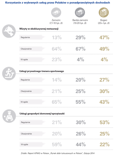 Badanie KPMG potwierdza, że wraz ze wzrostem poziomu dochodów rośnie także odsetek osób korzystających z określonych usług luksusowych. Duża część osób o ponadprzeciętnych dochodach deklaruje, że odwiedza ekskluzywne restauracje. Najczęściej regularnie odwiedzają je osoby bogate. Podobnie wygląda korzystanie z usług prywatnego trenera (regularnie korzysta z nich 14% zamożnych i 27% bogatych) czy gospodyni domowej (regularnie korzysta z tej usługi 21% zamożnych i 53% bogatych).