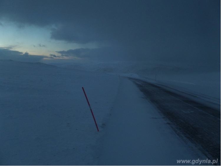 „Na Nordkappie dowiedzieliśmy się, że właśnie trafiliśmy na prawdopodobnie ostatni konwój przez kolejne dni. Z powodu ciężkich warunków atmosferycznych, huraganowych wiatrów, 25 metrowych fal dojazd na Nordkapp i Knivskjellodden zostanie zamknięty. W tych warunkach przebycie drogi na Knivskjellodden jest niemożliwe” – relacjonuje Łukasz Niesiobędzki. Gdynianie wyjechali z Nordkappu ostatnim konwojem. Przez dwa dni czekali na zmianę pogody. W końcu wykąpali się w okolicach Skarsvag -najdalej na północ wysuniętej wioski rybackiej.