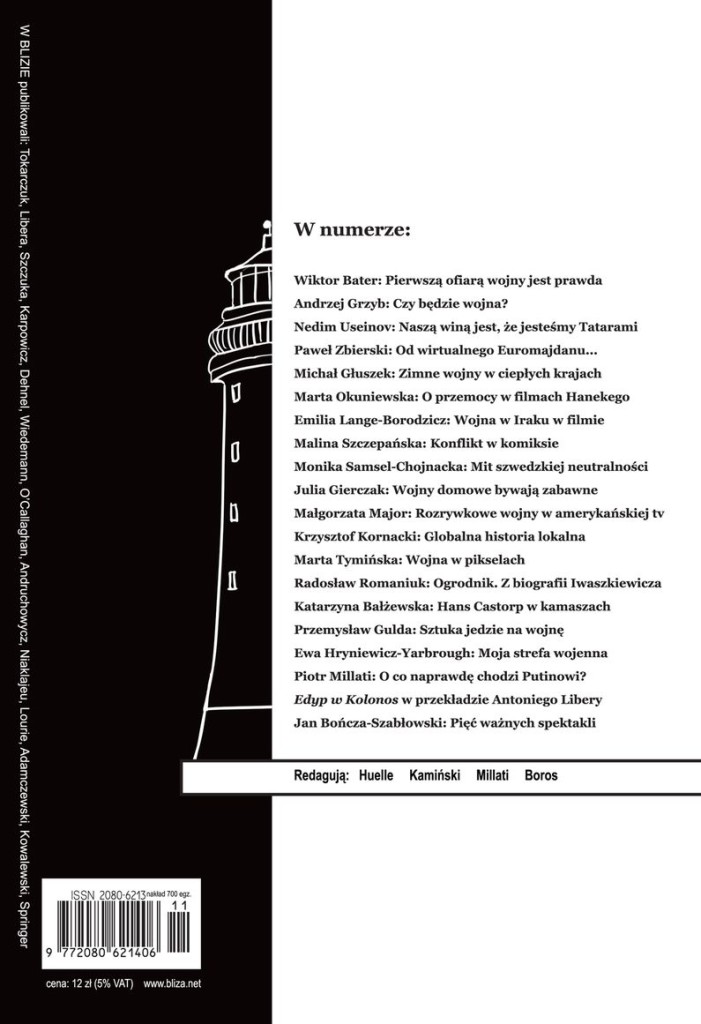 W numerze 4 (21) 2014 zastanawiamy się nad różnymi konotacjami zjawisk konfliktu, agresji, brutalności. Konteksty historyczne traktujemy jako perspektywę mówienia o współczesnych i możliwych w przyszłości wojnach między kulturami, państwami i ludźmi. Interesuje nas szeroko rozumiana konfrontacja cywilizacji, obyczajów, płci, poglądów i jednostek. Jej wpływ na losy grup ludzi i jednostek. Nie trzeba dodawać, że pretekstem do powstania 21. „Blizy” stały się najnowsze wydarzenia na świecie.