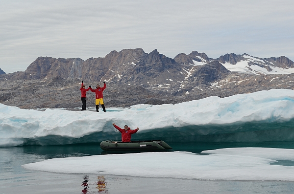 Cóż, nie trzeba nam było dwa razy powtarzać – ledwie po kilkunastu minutach przebrana w suchary i obładowana wszelakim sprzętem ekipa spuszczała na wodę ponton i kajak. Procedurę desantowania wspinacza na górę lodową opracowaliśmy w niedzielę, więc samo lądowanie przeszło bez historii. Dodatkowy czekan bardzo usprawnił system cumowania pontonu do lodu, dzięki czemu załoga pontonu mogła uwolnić przynajmniej dwie dodatkowe ręce – i w mniejszym chaosie zorganizować sesję zdjęciową. Minimalizacja chaosu – i bezpośrednio związanego z nim hałasu – była o tyle istotna, że hmm… pokrzykiwanie w bezpośredniej bliskości góry lodowej o średnio stabilnym kształcie wydawało się (nawet nam) nieco zbyt nierozsądne 🙂