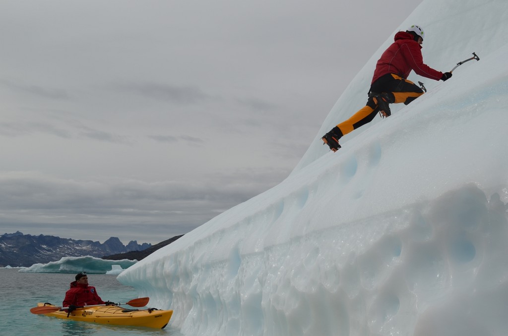 Do dwuosobowego, bardziej stabilnego kajaka zostały załadowane czekany lodowe, raki, kask – oraz Artur – aby w asyście pontonu i drugiego z kajaków udać się pod górę lodową o poręcznym kształcie. Dziaba, dziaba, prawy rak, lewy rak – i znów dziaba, dziaba, rak, rak… z pozoru mozolnie ale bardzo sprawnie na czubkach czekanów i butów Artur posuwał się do góry. Widok niesamowity – i niesamowicie abstrakcyjny w morskim kontekście.! I satysfakcja, kiedy udało się nie tylko wejść na górę, ale również zejść do kajaka – suchym rakiem?