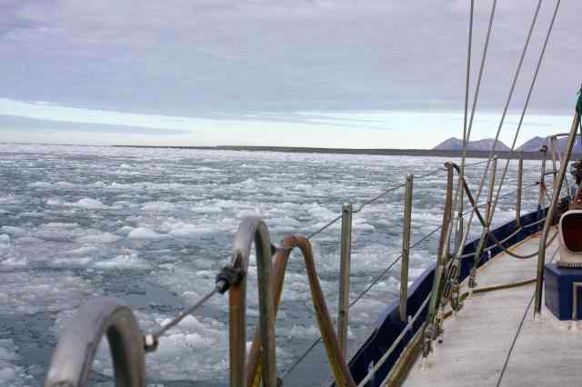 Szliśmy powoli na silniku tuż przy granicy pola lodowego. W pewnym momencie spomiędzy okruchów lodu wynurzyło się olbrzymie, białe, futrzaste cielsko.! Misiek zobaczył nas, przerwał nurkowanie i przez dłuższą chwilę lustrował nas wzrokiem. Był dość daleko, ale nawet z takiej odległości budził respekt. Niebieski kadłub Barlovento najwyraźniej nie wydał mu się apetyczny, bo na do widzenia obrzucił nas lekceważącym spojrzeniem – i dal nura w przerębel.