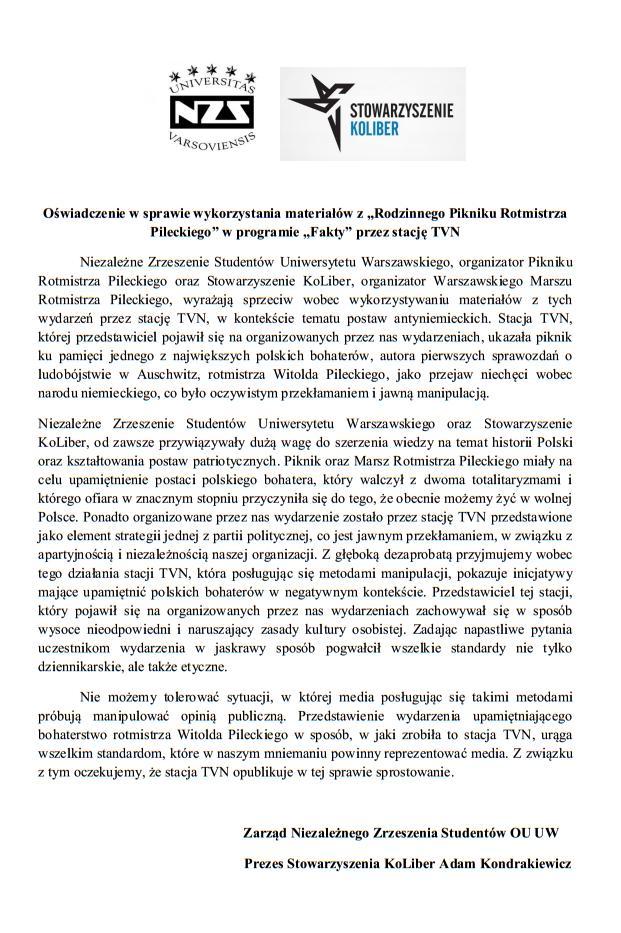 „Jawna manipulacja TVN”. Studenci oburzeni relacją z Marszu Pileckiego pokazaną w tdelewizyjnych „Faktach”. 11  maja odbył się piknik rodzinny oraz Warszawski Marsz Rotmistrza Pileckiego. Brał udział w nich reporter TVN. I jak zrelacjonował oba wydarzania. „W wieczornym paśmie Faktów ukazały materiały z tych wydarzeń w kontekście tematu postaw antyniemieckich” – nie ukrywa oburzenia Monika Sobczak, przewodnicząca Niezależnego Zrzeszenia Studentów Uniwersytetu Warszawskiego, współorganizator wydarzenia.