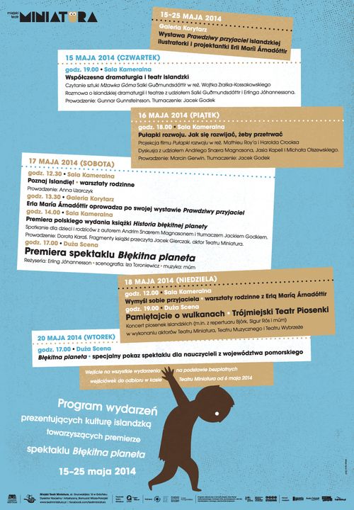 Premierze będzie towarzyszył program wydarzeń prezentujących kulturę islandzką. W czwartek 15 maja odbędzie się czytanie sztuki „Mżawka Górna” młodej, ale już zauważonej nie tylko na Islandii, dramatopisarki i tłumaczki Salki Guðmundsdóttir, które wyreżyseruje Wojtek Zrałek-Kossakowski, znany trójmiejskiej publiczności z pracy przy spektaklu „Sprawa operacyjnego rozpoznania” w Teatrze Wybrzeże. Po czytaniu dyskusja o współczesnym teatrze i dramaturgii islandzkiej z udziałem autorki oraz Erlinga Jóhannessona, którą poprowadzi Gunnar Gunnsteinsson z Islandzkiego Stowarzyszenia Teatrów Niezależnych, aktor, reżyser, dramaturg. Od 15 maja będzie również można w Galerii Korytarz Miniatury obejrzeć wystawę „Prawdziwy przyjaciel” islandzkiej ilustratorki i projektantki Erli Maríi Árnadóttir. Artystka wysłuchała opowieści dzieci i dorosłych z całego świata o ich obecnych lub dawnych zmyślonych przyjaciołach, a potem ich zilustrowała.