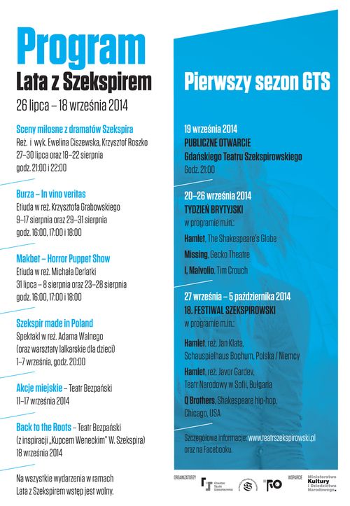 Lato z Szekspirem 26 lipca – 18 września 2014. W sobotę 26 lipca Gdański Teatr Szekspirowski inauguruje program: Lato z Szekspirem – stanowiący preludium otwarcia GTS – w ramach którego prezentowane będą spektakle w przestrzeni miejskiej oraz w Teatrze w Oknie.