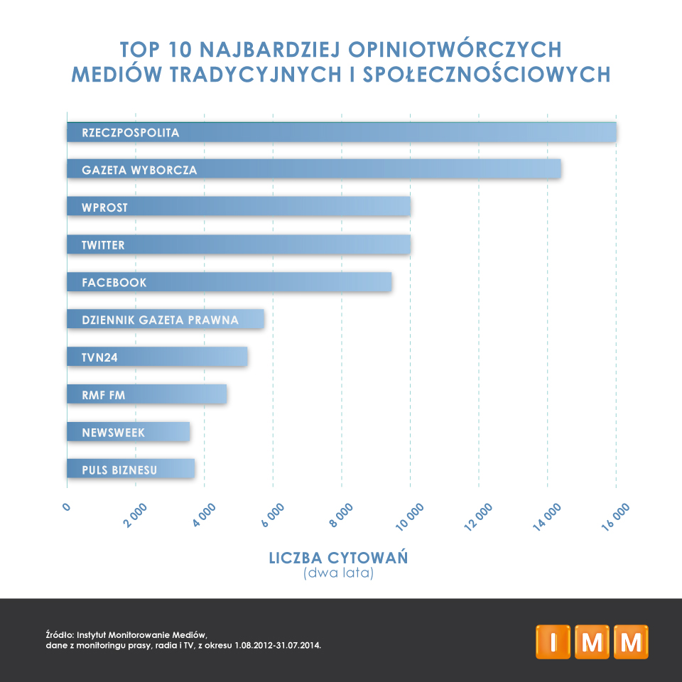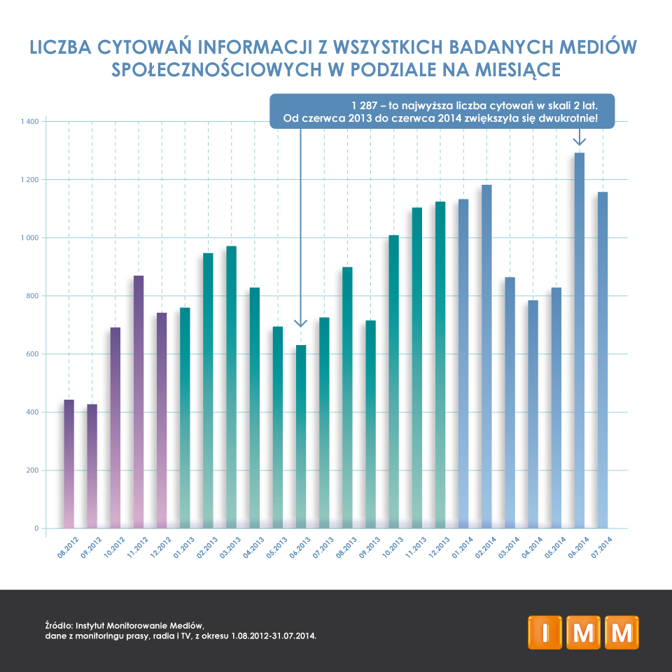 Instytut Monitorowania Mediów zaobserwował trzykrotny wzrost popularności wykorzystywania treści i materiałów z mediów społecznościowych w mediach tradycyjnych w okresie 2 lat. Prasa, radio i TV zwiększyły częstotliwość cytowania informacji z popularnych kanałów społecznościowych ze średnio 400 do średnio 1200 razy miesięcznie! Na uwagę zasługuje również porównanie najwyższej liczby cytowań z 2 lat, która przypada na czerwiec 2014. W tym miesiącu pojawiło się aż 1 287 cytatów ze wszystkich badanych przez IMM mediów społecznościowych. Natomiast rok wcześniej w czerwcu 2013 roku IMM zanotował dwa razy mniej cytowań.