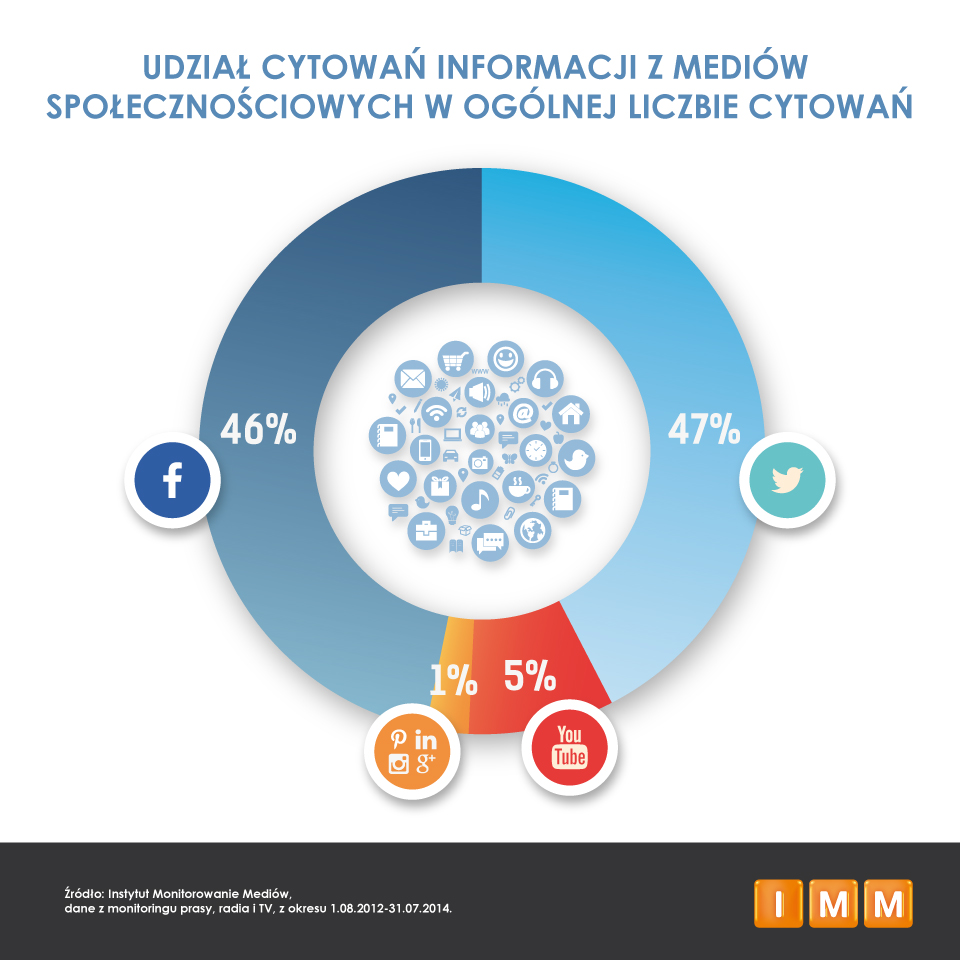 Z badania Instytutu Monitorowania Mediów wynika, że regularne powoływania na informacje zaczerpnięte z social media stały się powszechną praktyką w polskiej prasie, radiu i TV. Dane zostały zanalizowane w okresie: sierpień 2012 – lipiec 2014. W największej skali wykorzystywane są tweety (47 procent wszystkich cytowań), a tuż za nimi facebookowe posty (46 procent wszystkich cytowań). Z YouTube pochodzi natomiast 6 procent cytowań z social media, wykorzystywanych w badanych przez IMM mediach tradycyjnych. Pozostałe źródła społecznościowe uwzględnione w badaniu IMM mają najmniejszy – 1 procentowy udział.